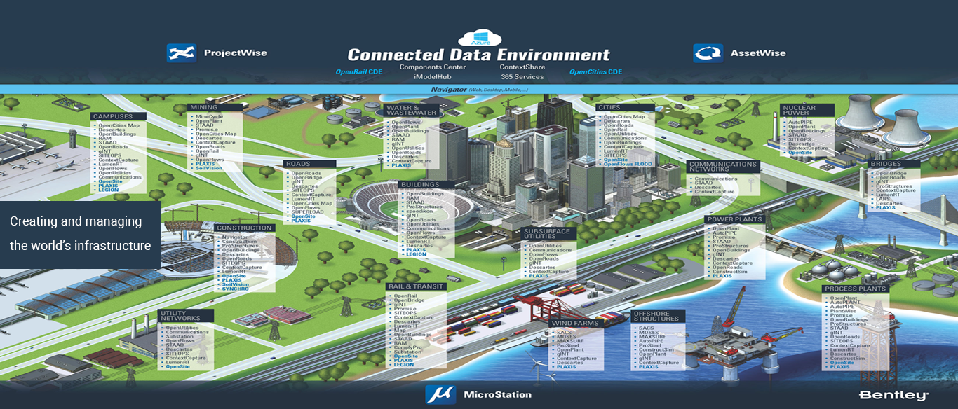 Today’s infrastructure projects require integrated solutions to meet the demands of multi-discipline project teams actively engaged in planning, design, construction, and operations. Bentley offers a comprehensive range of world-class software solutions tailored to meet the unique needs of infrastructure professionals. Whether you work across several industries and project types or focus in one, Bentley’s solutions will support your work throughout the asset lifecycle.